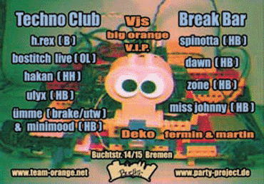 Als Gäste sind geladen: h.rex (B) - Marc Fischer wird uns 3 Stunden lang den frühen Morgen versüßen. bostitch (Ol) - Live aus Oldenburg hakan (HH) - With another beautifull set Eröffnet wird der ganze Spaß von ulyx Das Ende gestallten diesmal das dynamische Duo ümme und minimood Das visuelle Ambiente teilen sich V.I.P. und big orange mit schnellen Projektionen und psychodelemorphen Bild-Sequenzen, gemixt mit real time Video Shots und anderen bekannten und selbstgedrehten Filmen. Die Dekoration und die Erichtung